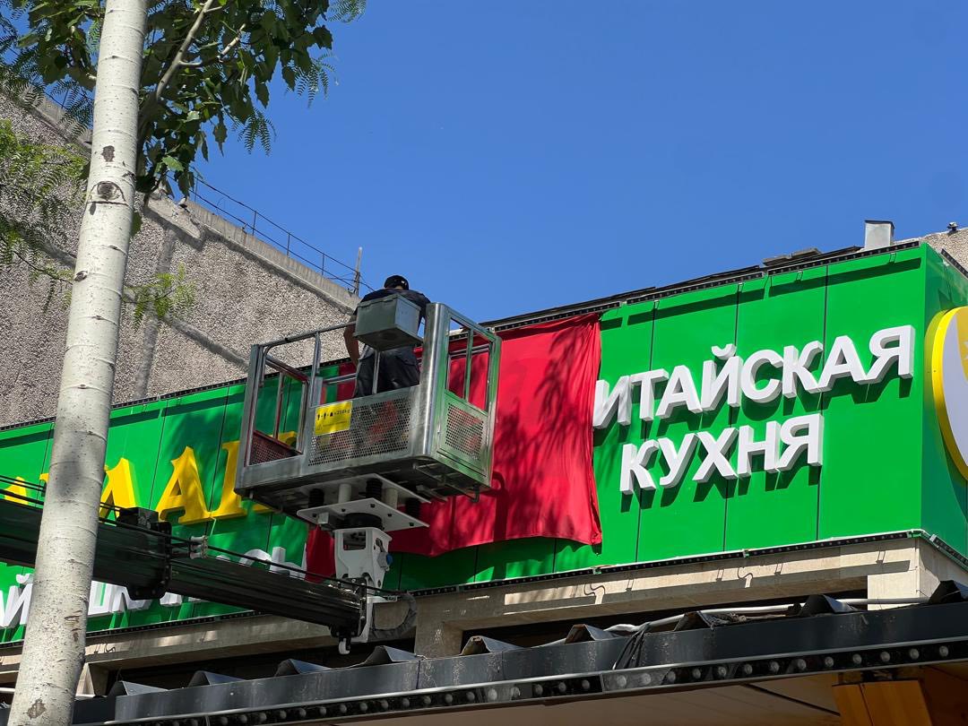 Уточняется, что осуществлялись работы по выявлению и демонтажу рекламных вывесок и информационных конструкций, не соответствующих требованиям законодательства о государственном языке и утвержденному дизайн-коду. Демонтированы вывески нескольких кафе в Свердловском районе - «Ред Сан», «МР Хого», «Лулан», «Сфера», «1919», а также магазин «Хого».