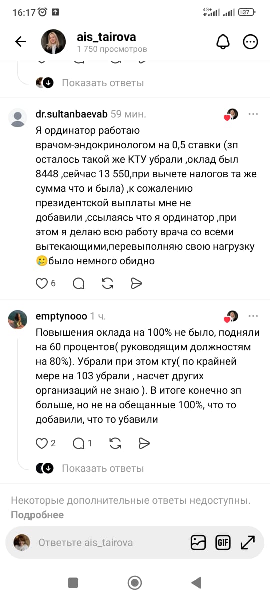«Почему президентскую компенсацию не дают внештатным сотрудникам, если работаешь по совместительству? Я работаю штатным сотрудником в качестве преподавателя в вузе и как врач в поликлинике. Почему мы получаем только голый оклад? Как вы будете мотивировать молодых врачей? У меня врачебный стаж 8 лет, я за него не получаю, как и надбавку мэрии. При этом в день 20-30 больных за 3,5 часа работы каждый день. Еще одно субботнее дежурство в месяц. В общем не надо было ничего ожидать, чтобы потом не разочароваться», — написала одна из врачей.