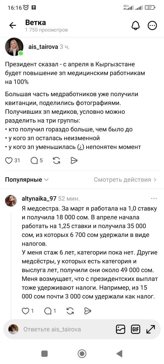 Ранее власти анонсировали 100-процентное повышение зарплат медикам. По расчетам чиновников, если молодые врачи, недавно окончившие медицинские учебные заведения и только начавшие работать, получали 13 тысяч 581 сом, то с апреля их зарплата составит 35 тысяч 248 сомов. У врачей с большим стажем она будет выше. Зарплату медсестер обещали увеличить почти в три раза — с 8 тысяч 541 до 29 тысяч 53 сомов (без учета дополнительных выплат и надбавок за работу в высокогорных и отдаленных районах).