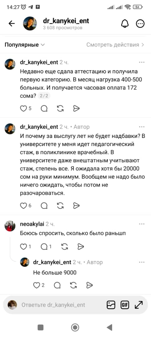 В среднем должностные оклады у врачей поднялись на 60 процентов, плюс есть президентская компенсация (15 тысяч сомов за ставку).