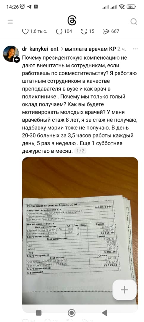 В Кыргызстане при повышении зарплаты медицинским работникам с 1 апреля 2026 года убрали коэффициент трудового участия (КТУ). Об этом 24.kg подтвердили медики.