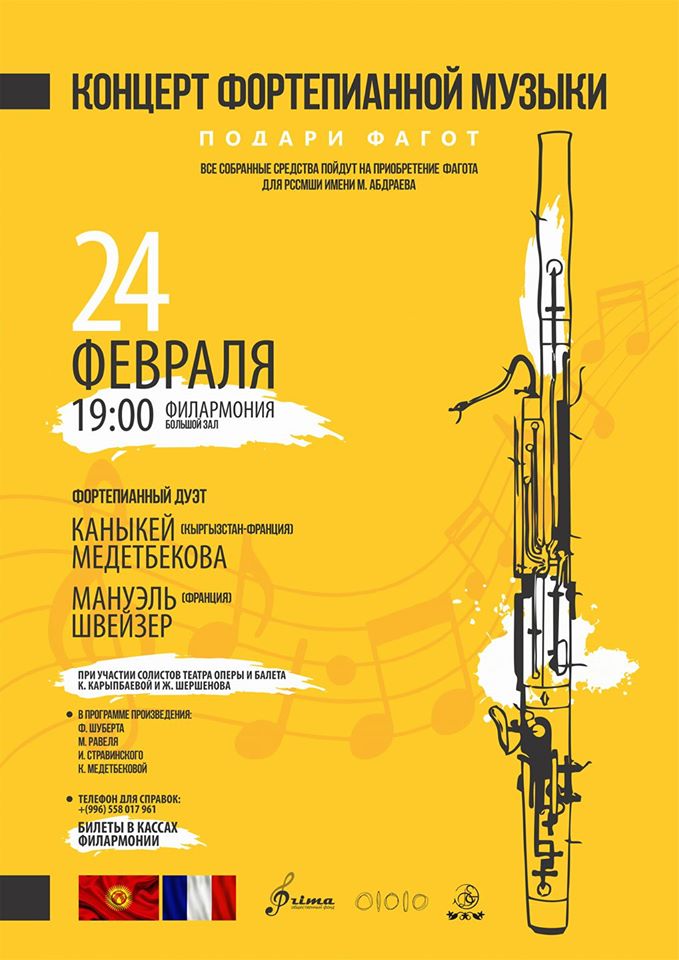 Концерт инициирован пианисткой Каныкей Медетбековой и ее супругом пианистом Мануэлем Швейзером, которые являются профессорами Лионской консерватории во Франции. Музыканты дадут концерт безвозмездно, с участием солистов оперы и балета К.Карыпбаевой и Ж.Шершенова. Все вырученные средства пойдут на приобретение фагота для РССМШИ имени М.Абдраева.