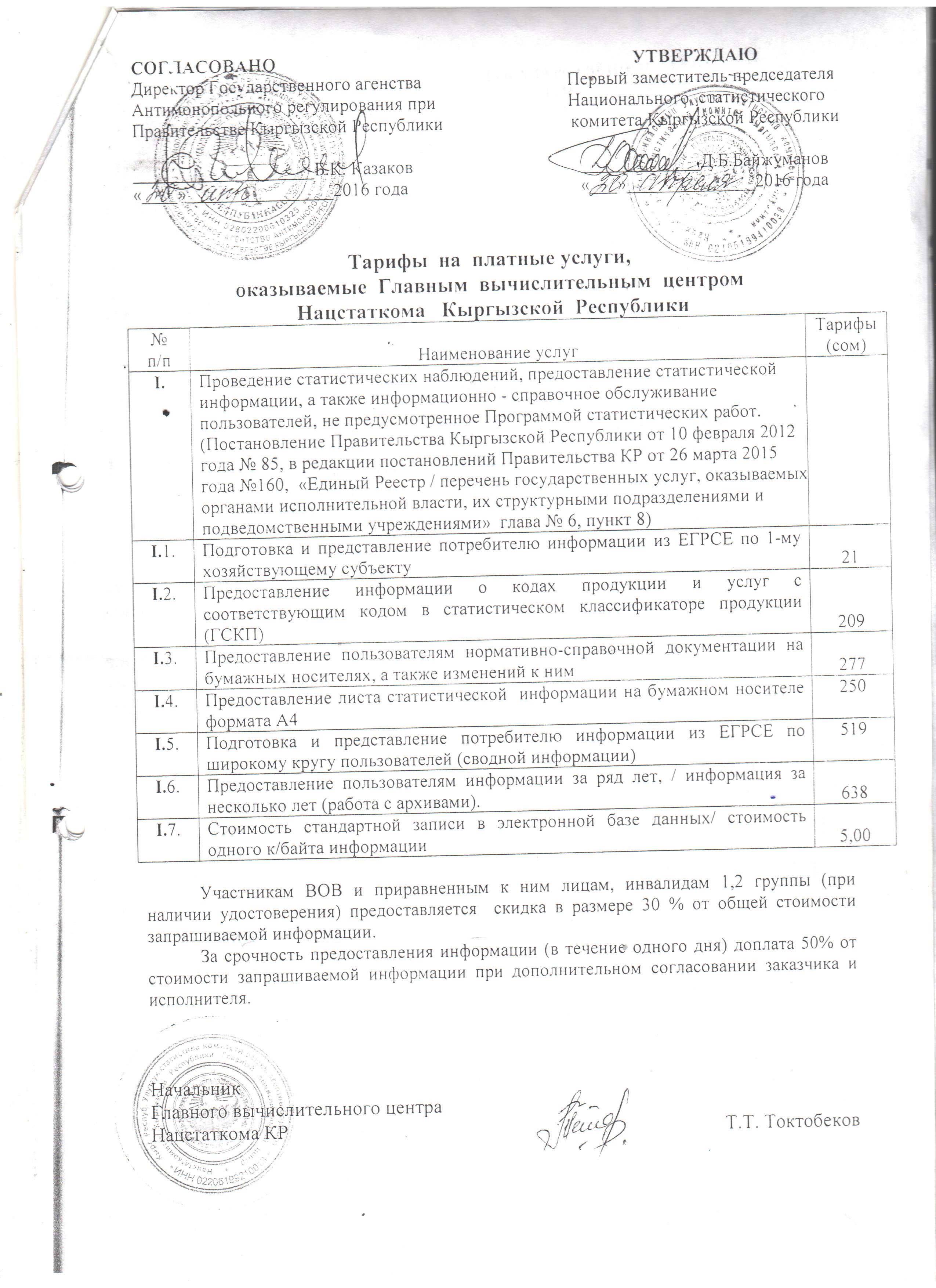 По информации ведомства, лист статистической информации на бумажном носителе формата А4 стоит 250 сомов в соответствии с тарифами на платные услуги, которые согласованы с Госагентством по антимонопольной политике и развитию конкуренции при правительстве КР от 18 апреля 2016 года.