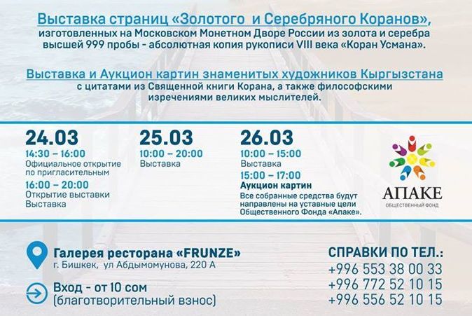 Около 25 знаменитых художников Кыргызстана предоставят лучшие картины, посвященные темам нравственности, духовности и философии. Желающим будет предоставлена возможность приобрести картины на аукционе 26 марта 2017 года там же. Все средства, вырученные от продаж, пойдут на благотворительные цели. Подробнее