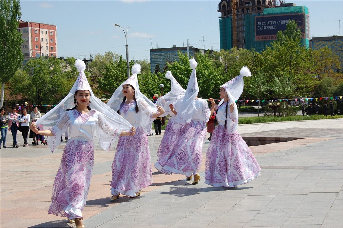 На площади Победы праздник организован Свердловской районной администрацией. Перед горожанами выступают клоуны, юные манасчи, певцы и танцоры. Организованы рисунки на асфальте и спортивная эстафета.