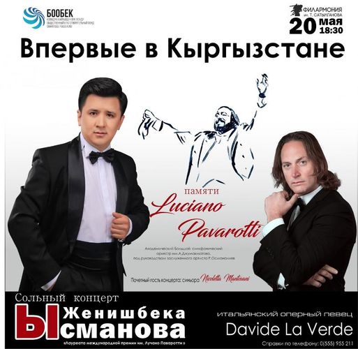 В концерте примет участие и оперный певец из Италии Давиде Ла Верде. Играть будет Академический большой симфонический оркестр имени Джумахматова под руководством заслуженного артиста Кыргызстана Рахата Осмоналиева. Кроме того, организаторы обещают сюрпризы. Подробнее