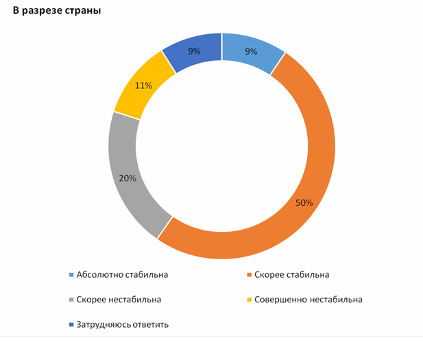 Так, 9 процентов считают, что ситуация в стране абсолютно стабильная, 20 процентов — скорее нестабильная, 11 процентов — абсолютно нестабильная.