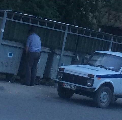 Страж порядка справляет нужду возле мусорных контейнеров. Рядом стоит ведомственная автомашина с гоносмером MVD 142B.
