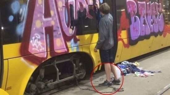 Подавать заявление по поводу вандализма машинисты не стали, так как сами справились: они приковали 22-летнего хулигана цепью к колесу трамвая и заставили его отмывать граффити в течение 9 часов.