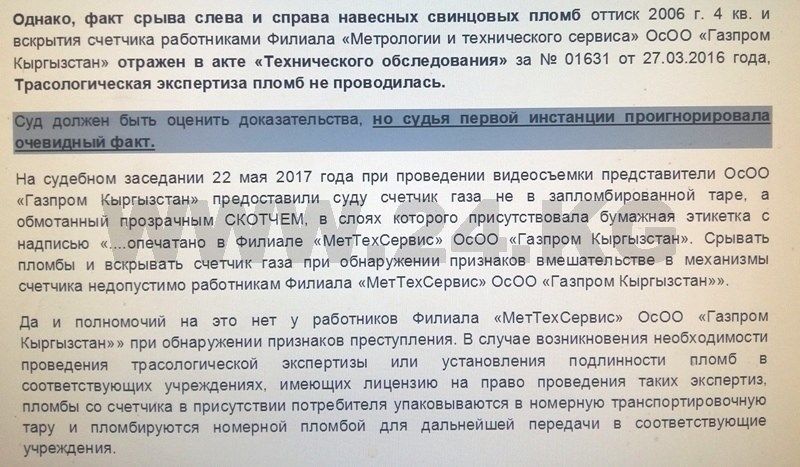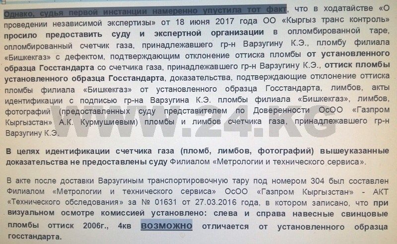 — ОсОО «Газпром Кыргызстан», не проверив должным образом процедуры оформления документов, при полном отсутствии технических сертифицированных экспертиз приняло к исполнению протокольное решение конфликтной комиссии «Бишкекгаз», начислив материальный ущерб в размере 16 тысяч 690,46 сома.