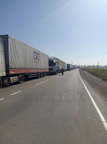 Пробка из большегрузных машин начинается за несколько километров от КПП «Ак-Тилек», буквально с объездной дороги. В начале этой вереницы занята только одна полоса дороги, ближе к КПП забита и вторая обочина, для проезда остается лишь узкий коридор. В одном месте и вовсе проезд возможен только по одной из обочин: обе полосы заняты фурами.