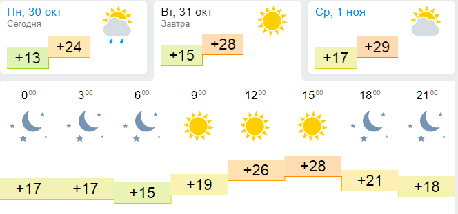 В Бишкеке 31 октября по-настоящему жарко. Температура воздуха прогреется до +28 градусов, без осадков. День уменьшился до 10 часов 21 минут: восход Cолнца в 7.34, заход — в 17.55. Наибольшие возмущения в геомагнитном поле ожидаются в 6.00, 9.00, 12.00 и 18.00. С прогнозом погоды по Кыргызстану можете ознакомиться здесь.