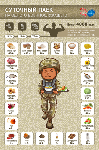 В зависимости от условий службы калорийность солдатского пайка и его стоимость варьируются.
