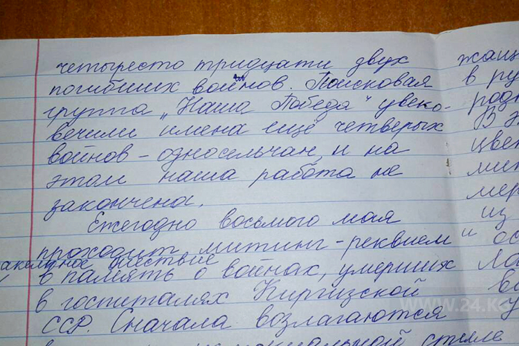 «Всего в группе 12 человек, включая студентов, которые живут в Бишкеке, поэтому они преимущественно выполняют архивную работу. А школьники следят за памятником в центре села, проводят субботники, участвуют в конкурсах. Вот Саша Бутрин недавно послал сочинение на Общероссийский конкурс «Дорога к обелиску». В нем надо было рассказать о памятнике в том населенном пункте, где вы проживаете. Ждем результата», — говорит Екатерина Дятлова.