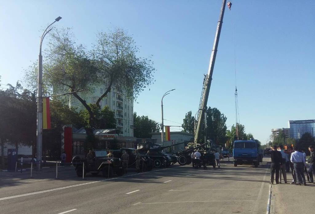 На площади Победы в Бишкеке начали устанавливать военную технику. Среди экспонатов легендарный танк Т-34. Он был восстановлен к юбилею Победы в 2015 году и открывал парад.