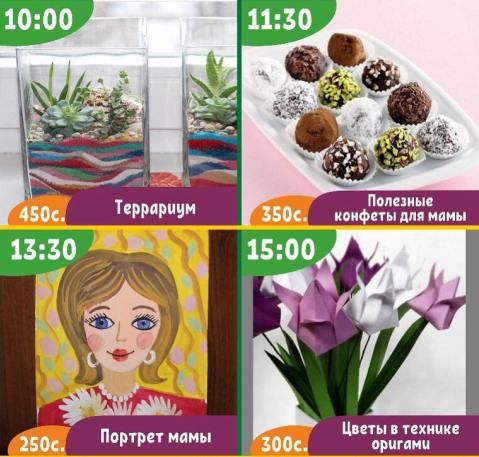 В эту субботу пройдут мастер-классы «Террариум», «Конфеты для мамы», «Рисование гуашью», «Тюльпаны из бумаги для мамы». В стоимость включены материалы. Запись по телефону 0770224525.