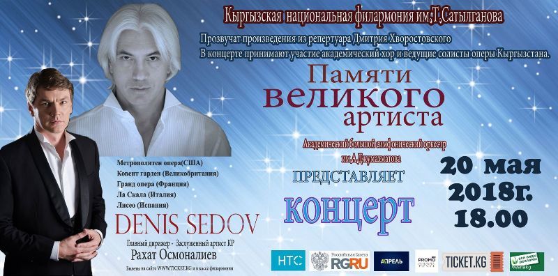Прозвучат произведения из репертуара Дмитрия Хворостовского. Почетный гость — Денис Седов. Главный дирижер — заслуженный артист КР Рахат Осмонгалиев.
