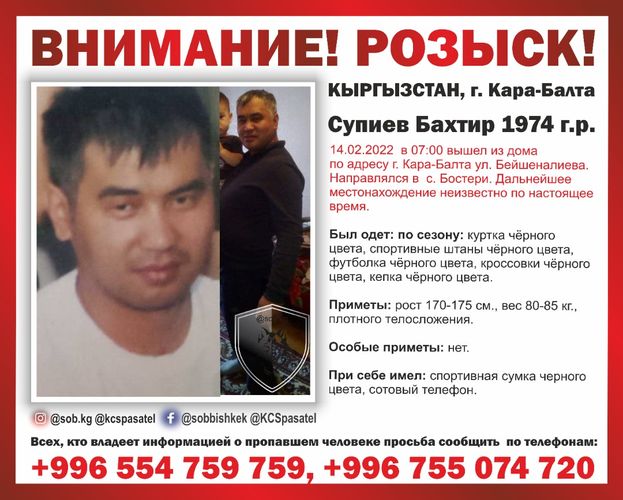 14 февраля мужчина вышел из дома в Кара-Балте. Направлялся в Бостери. Дальнейшее его местонахождение неизвестно.