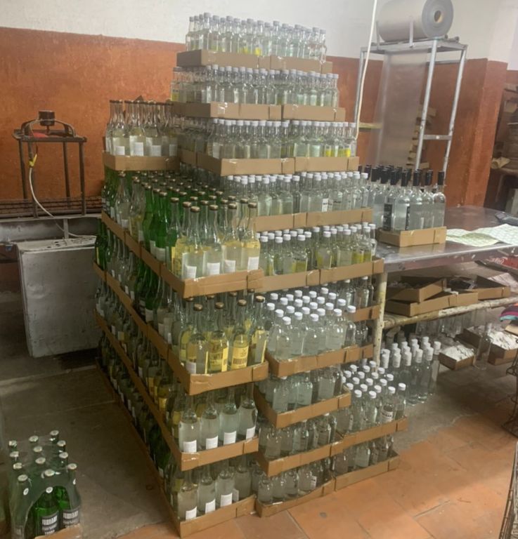 При обыске также нашли 28 тонн неучтенного этилового спирта, более 100 тысяч экземпляров сомнительных неиспользованных акцизных марок и прочих комплектующих изделий (пробки, фирменные этикетки и прочее).