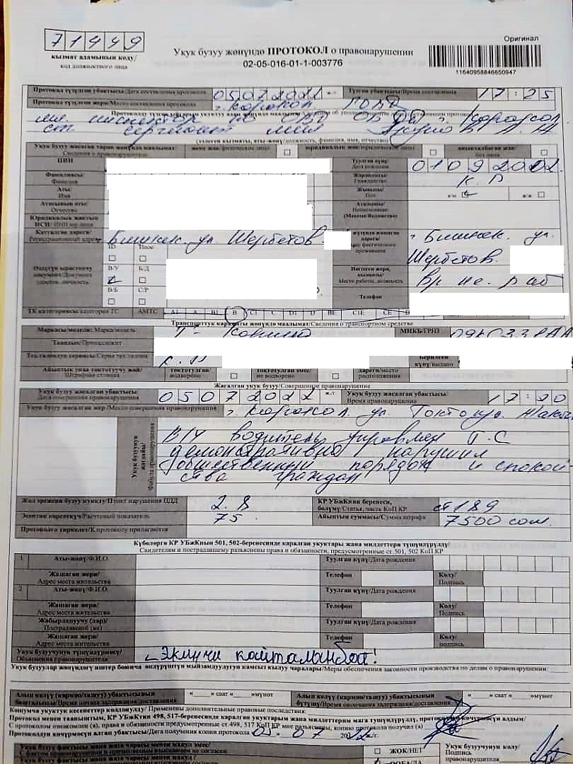 Автомашина поставлена на штрафную стоянку. Водитель за автохулиганство оштрафован на 7,5 тысячи сомов.