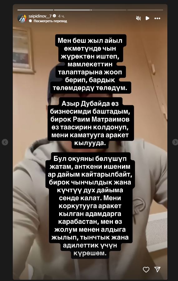 «Я считаю, что это часть действий, предпринимаемых против меня Раимбеком Матраимовым. Дело в том, что мне известны многие из его скрытых дел — в том числе факты, связанные со смертью Айеркена Саймаити, журналиста Улана Эгизбаева и другие. По моему убеждению, Раимбек Матраимов стремится устранить меня, чтобы эти сведения не стали достоянием общественности. Я не доверяю сотрудникам милиции, поскольку считаю, что среди них есть лица, связанные с Раимбеком Матраимовым», — отметил Мунарбек Сайпидинов.