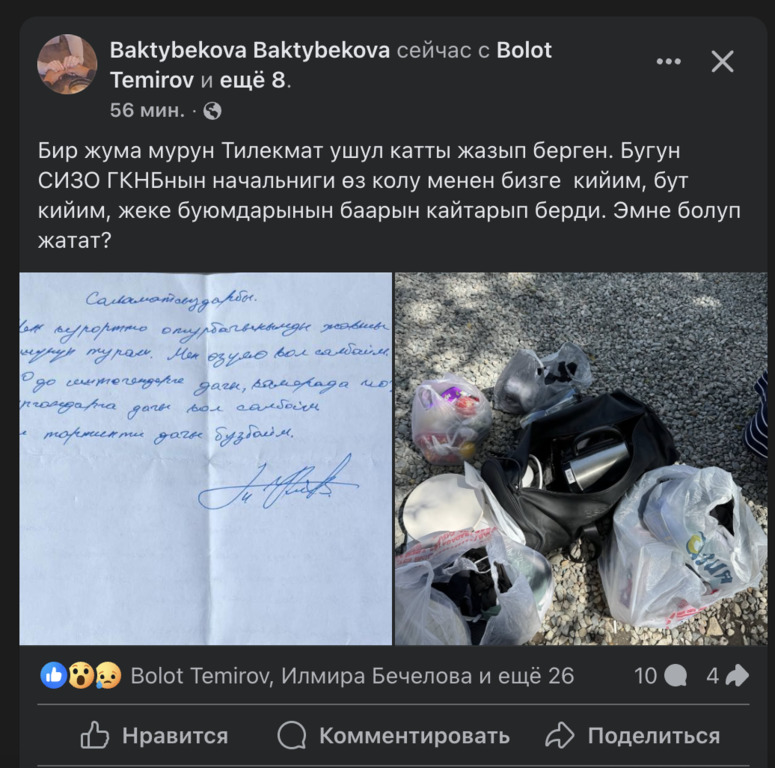 Начальник СИЗО ГКНБ вернул близким личные вещи Тилекмата Куренова. Об этом в соцсетях сообщила его супруга.