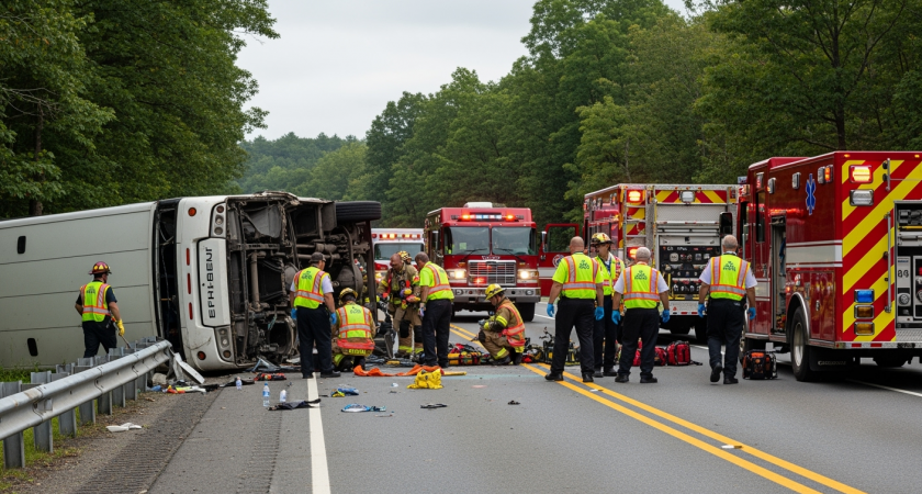 Полиция штата Нью-Йорк объявила, что погиб по крайней мере один ребенок и что внутри разбитого автобуса еще могут быть заблокированы тела.
