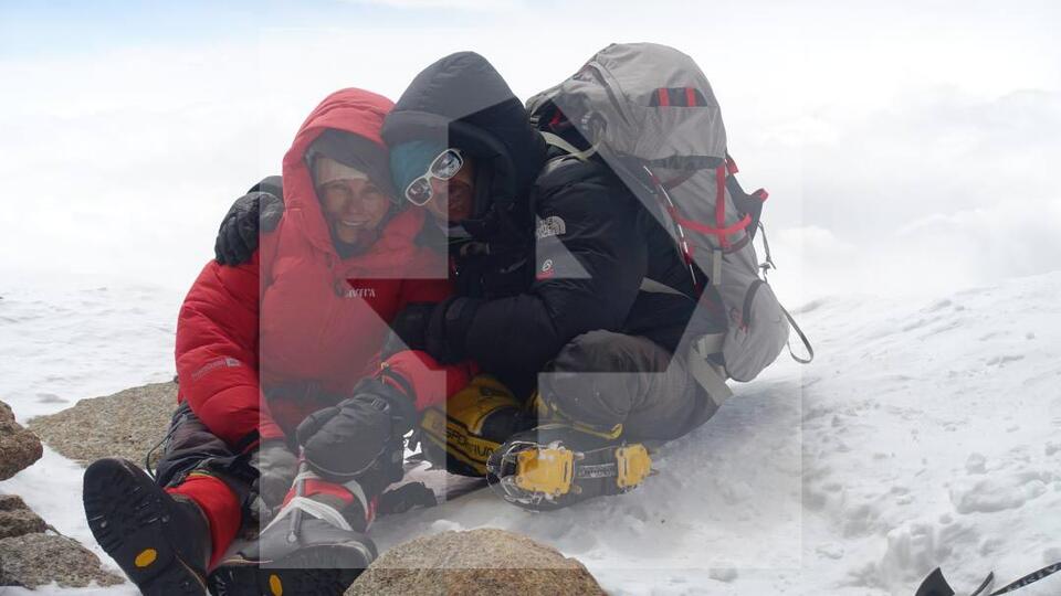 Отмечается, что на фото Наталья Наговицина уже с травмой ноги. Перелом зафиксирован палкой от палатки. Справа от альпинистки итальянец Лука Синигалья, который погиб, когда пытался помочь россиянке выбраться с вершины.