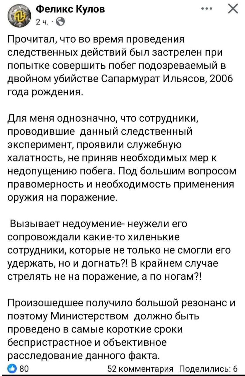Бывший министр внутренних дел и экс-глава правительства Феликс Кулов прокомментировал ликвидацию подозреваемого в двойном убийстве Сапармурата Ильязова. Он опубликовал пост на своей странице в соцсетях.