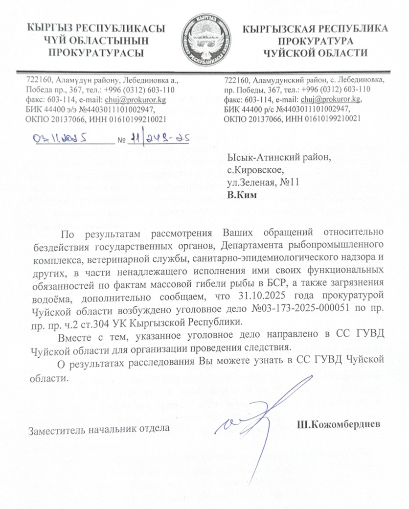 В итоге владелец водоема Виктор Ким понес материальный ущерб в 24,5 миллиона сомов, так как в пруду находилось 90 тонн рыбы. Он обратился в прокуратуру Чуйской области. Там провели комплексную проверку, зафиксировали загрязнение поверхностных вод, составили акты о нарушениях и возбудили уголовное дело. Далее материалы направили для расследования в ГУВД региона.