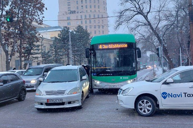 На пересечении улиц Московской и Тыныстанова в Бишкеке столкнулись автомобиль Toyota Ipsum и электробус № 4, следовавший по маршруту. Водители недоумевают, каким образом автобус оказался на встречной полосе.