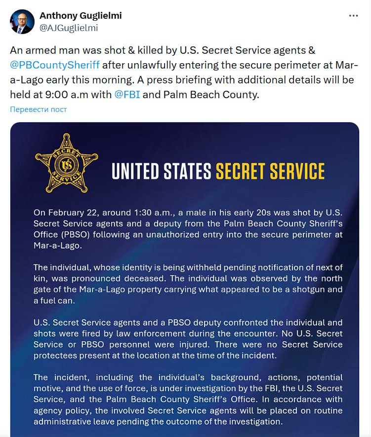 По предварительным данным, человек примерно 20 лет обнаружен у северных ворот поместья Мар-а-Лаго во Флориде. Его застрелили на месте. При себе у молодого человека нашли дробовик и канистру для топлива.