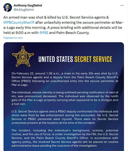 В США застрелили мужчину, который пытался попасть в резиденцию Дональда Трампа. Об этом заявил пресс-секретарь Секретной службы Соединенных Штатов Энтони Гульельми.