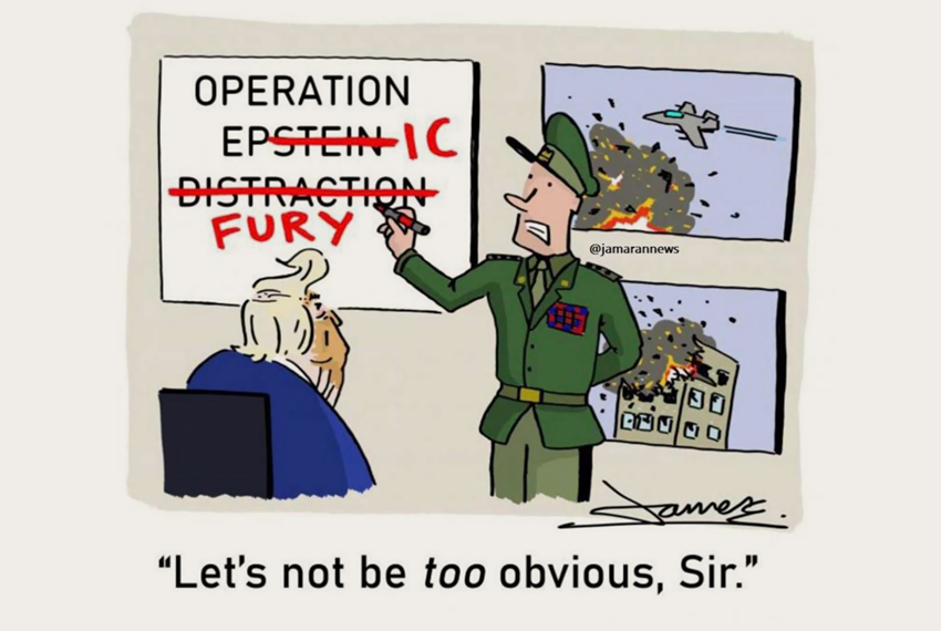 Посольство Ирана в Лондоне опубликовало карикатуру, в которой показано, что атаки США на Иран были попыткой прикрыть скандал по так называемым файлам Эпштейна.