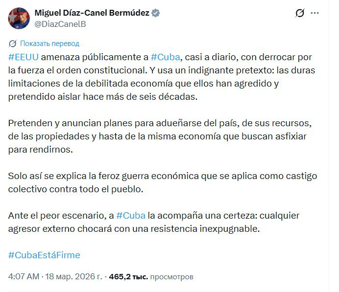 «США публично угрожают Кубе почти ежедневно свержением силой конституционного порядка. И используют возмутительный предлог: суровые ограничения ослабленной экономики, которую они атаковали и пытались изолировать более шести десятилетий. Они намерены и объявляют планы по захвату страны, ее ресурсов, имущества и даже самой экономики, которую стремятся задушить, чтобы заставить нас сдаться. Только так можно объяснить яростную экономическую войну, которая применяется как коллективное наказание против всего народа. Перед худшим сценарием у Кубы есть уверенность: любой внешний агрессор столкнется с неприступным сопротивлением», — написал он в соцсети X.