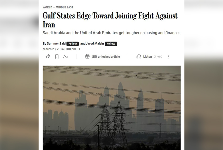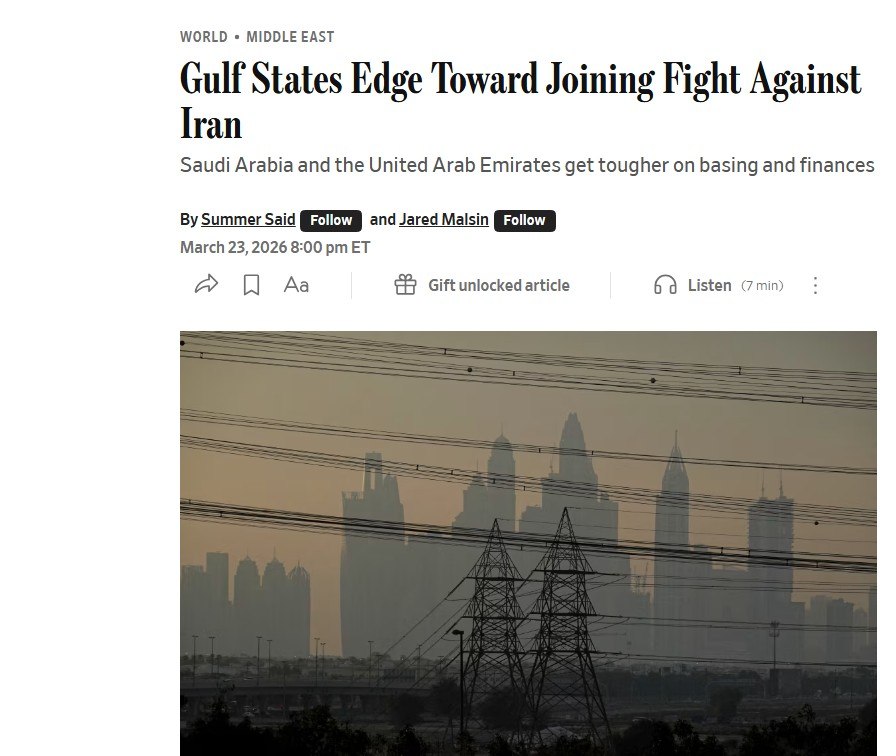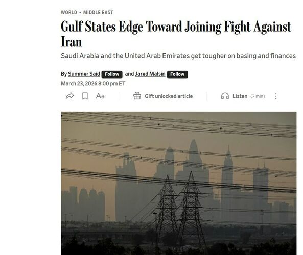 Газета The Wall Street Journal сообщила, что Саудовская Аравия и ОАЭ обсуждают вступление в войну в Иране, но пока ограничиваются предоставлением военной инфраструктуры и оказанием экономического давления на Тегеран.