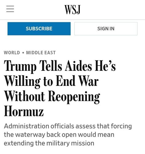 Дональд Трамп готов завершить противостояние с Ираном без открытия Ормузского пролива. The Wall Street Journal сообщает, что представители администрации заявили: президент Трамп сообщил своим помощникам о готовности прекратить военную кампанию США против Ирана, даже если Ормузский пролив останется в значительной степени закрытым. Это может означать сохранение фактического контроля Тегерана над стратегическим водным путем и перенос вопроса о его разблокировании на более поздний срок.