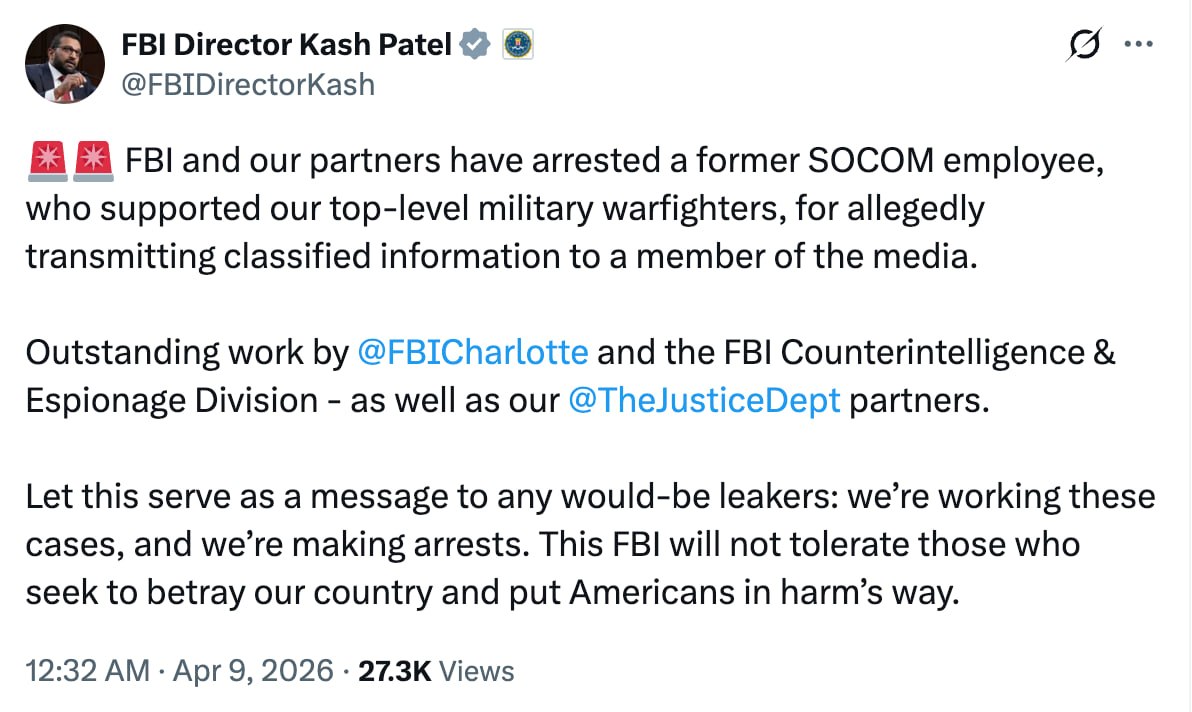 ФБР задержало экс-сотрудника командования спецопераций США по подозрению в передаче секретной информации СМИ. Об этом сообщил глава ведомства Каш Патель.