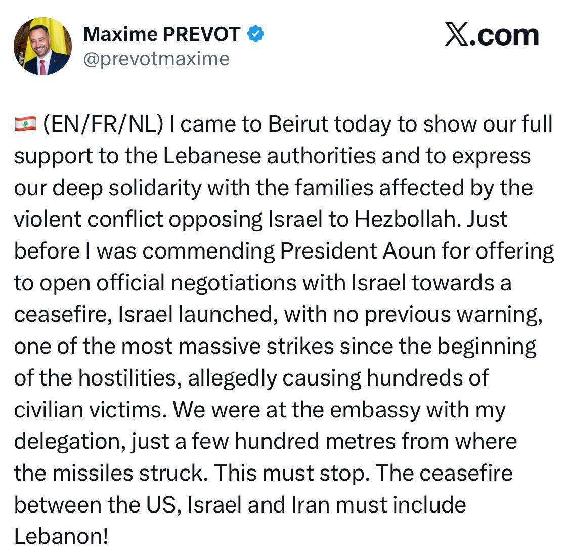 Глава МИД Бельгии Максим Прево едва не стал жертвой израильских ракетных ударов. Он приехал в Бейрут, чтобы выразить поддержку ливанским властям и солидарность с семьями, пострадавшими от конфликта между Израилем и «Хезболлой».