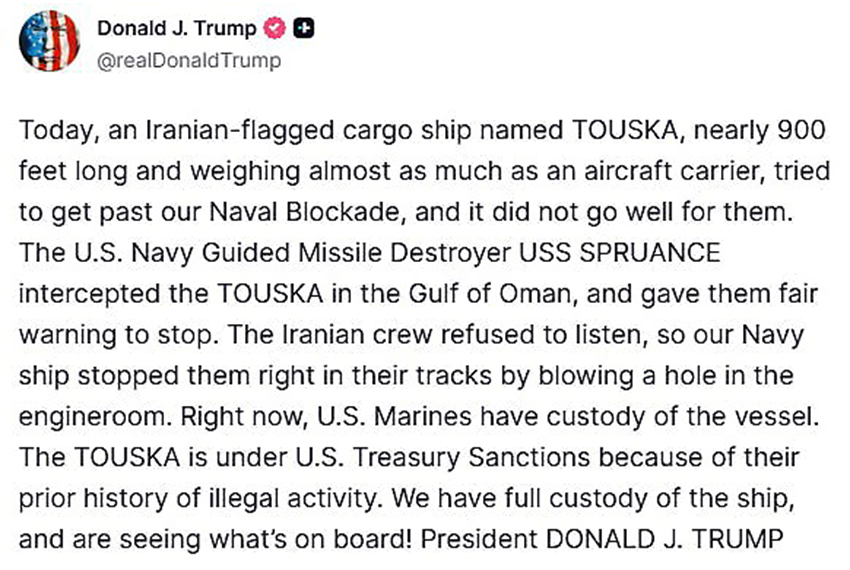 «Сегодня грузовое судно под иранским флагом TOUSKA длиной почти 900 футов [около 300 метров] и весом как у авианосца попыталось прорвать нашу морскую блокаду, но у них ничего не вышло. Ракетоносный эсминец USS SPRUANCE перехватил TOUSKA в Оманском заливе и выдал им четкое предупреждение остановиться.