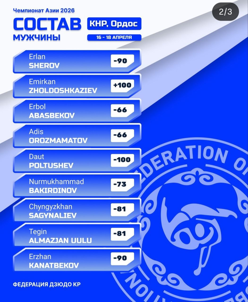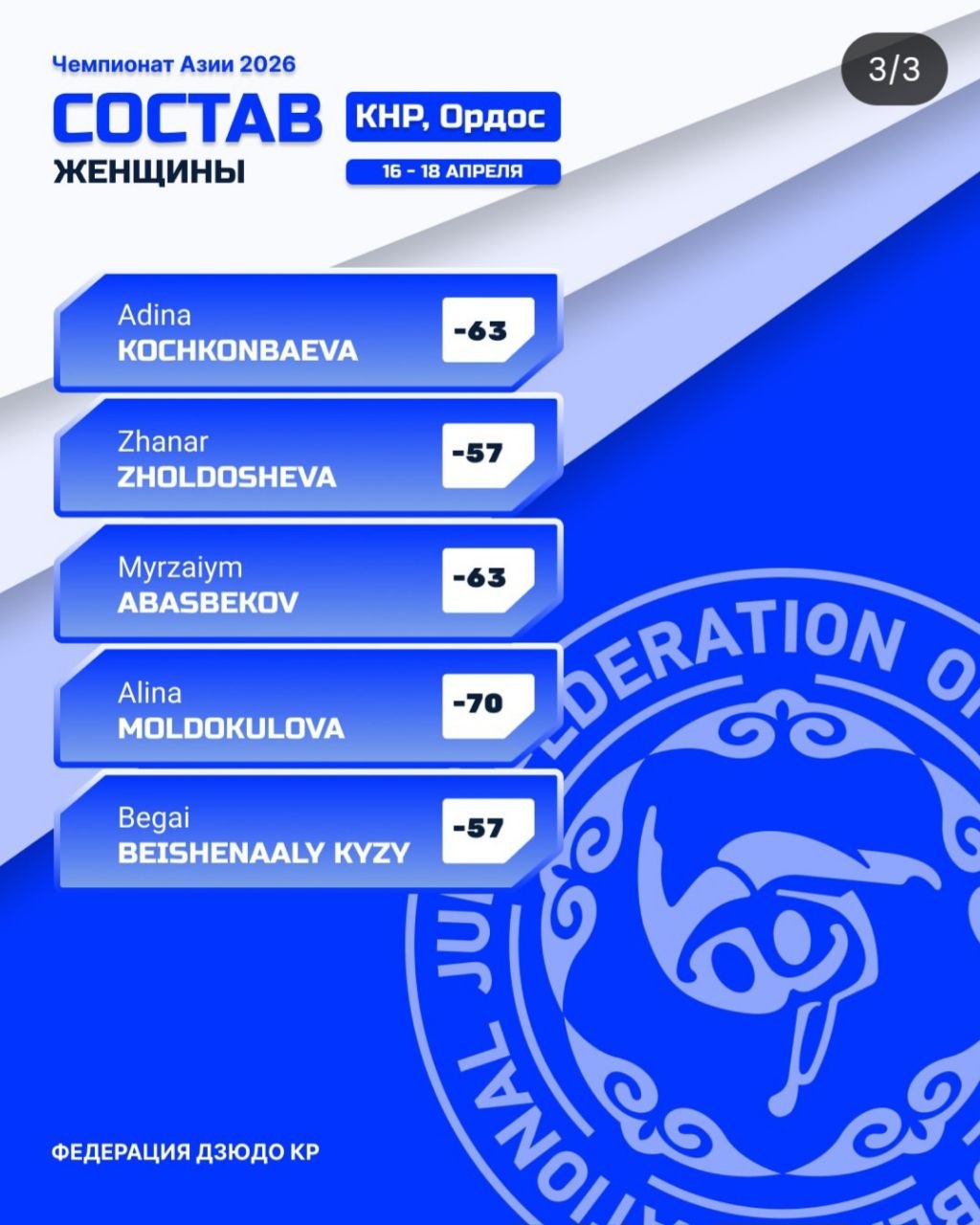 Турнир пройдет в Китае, в городе Ордос, 16-18 апреля. Лучшие спортсмены страны выйдут на татами, чтобы достойно представить Кыргызстан на континентальной арене.
