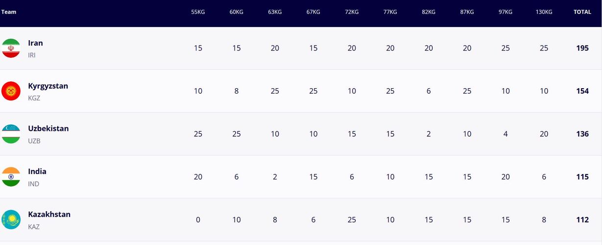 Сборная Кыргызстана заняла второе общекомандное место, уступив иранцам. На третьем — спортсмены из Узбекистана.