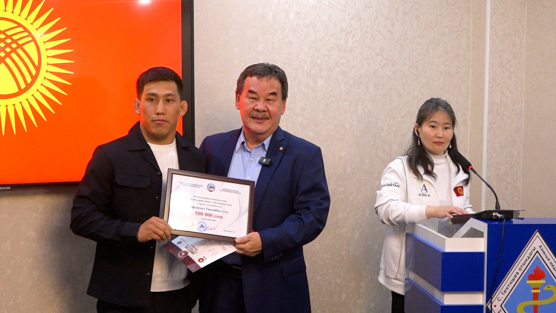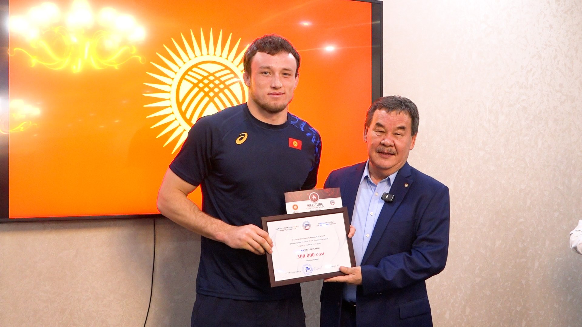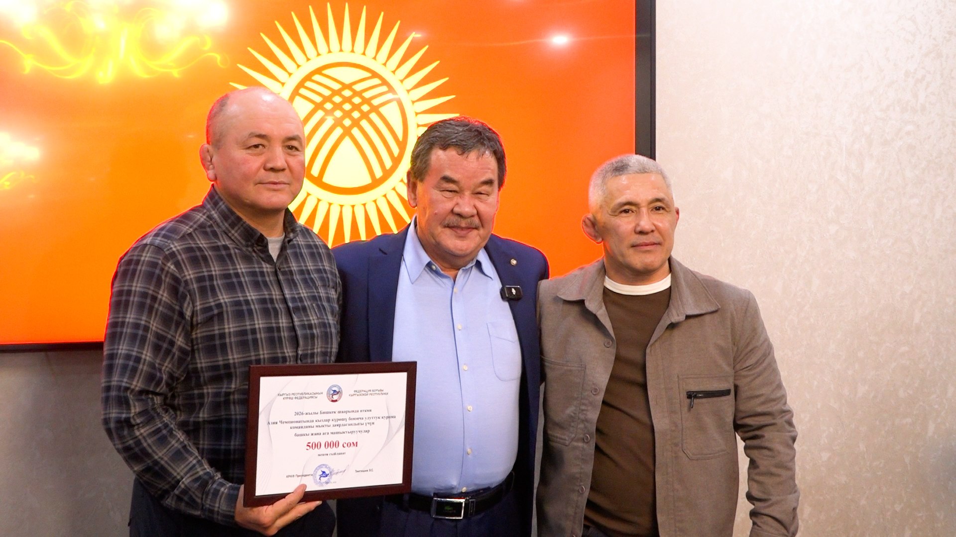 - Бронзовые медалисты (вольная борьба): Яков Чаплин, Абдымалик Карачов, Эрназар Акматалиев и Жакшылык Байташов. От Федерации борьбы — по 300 тысяч сомов, от Азиатского международного университета — по 70 тысяч сомов каждому.
