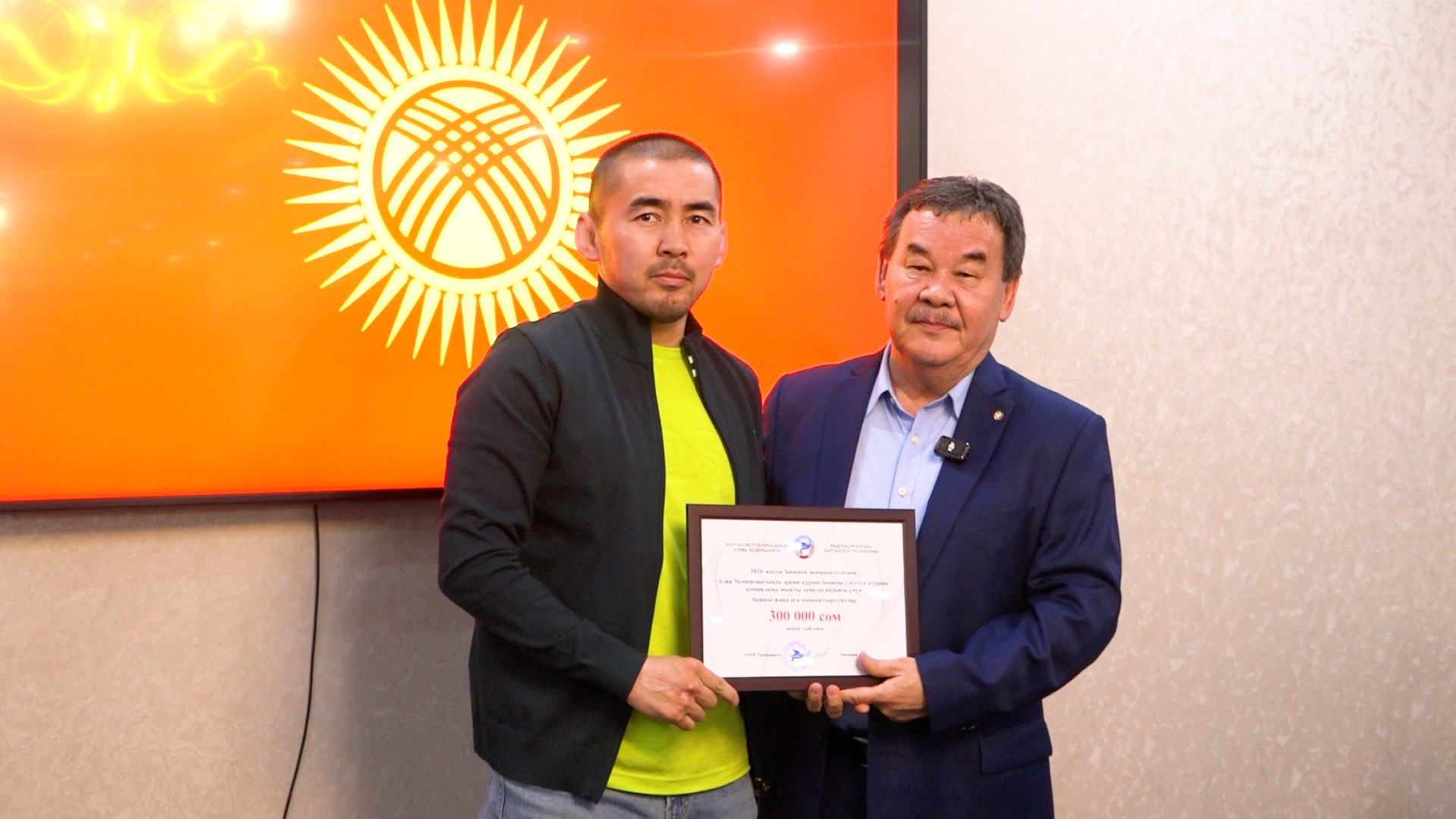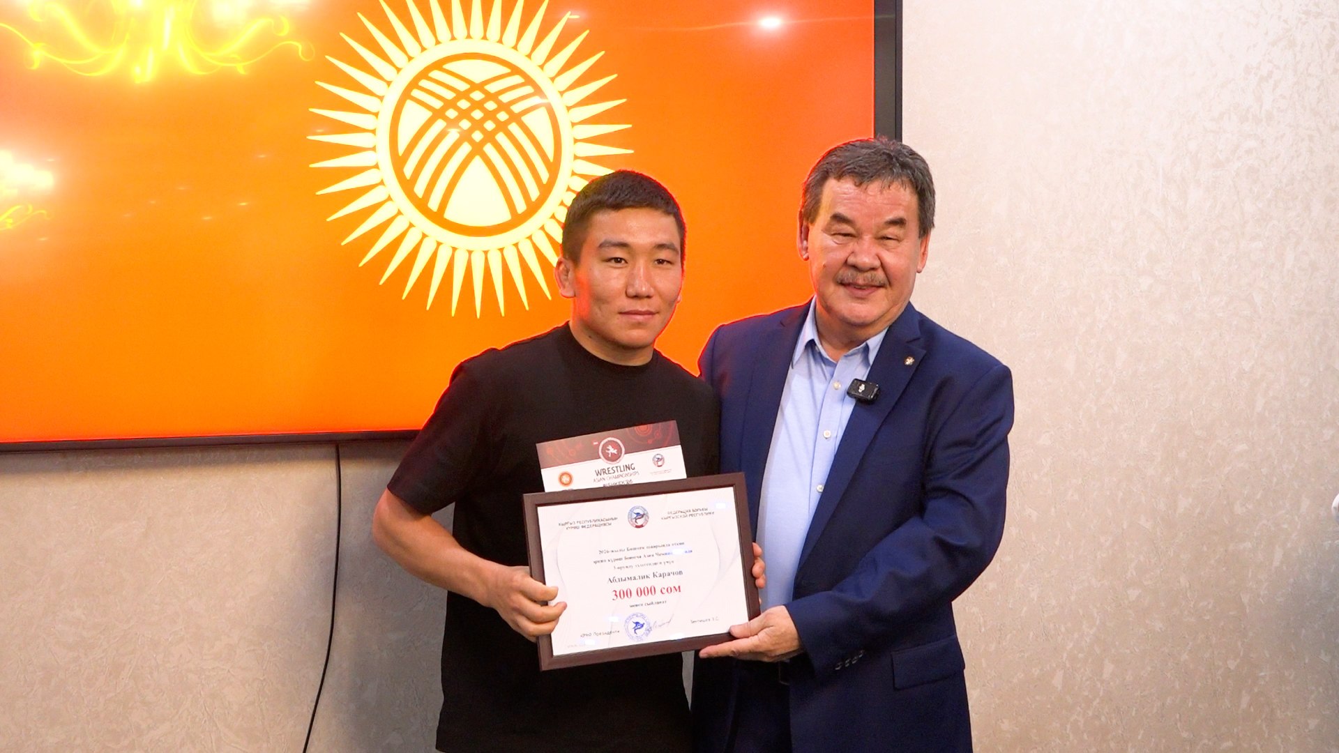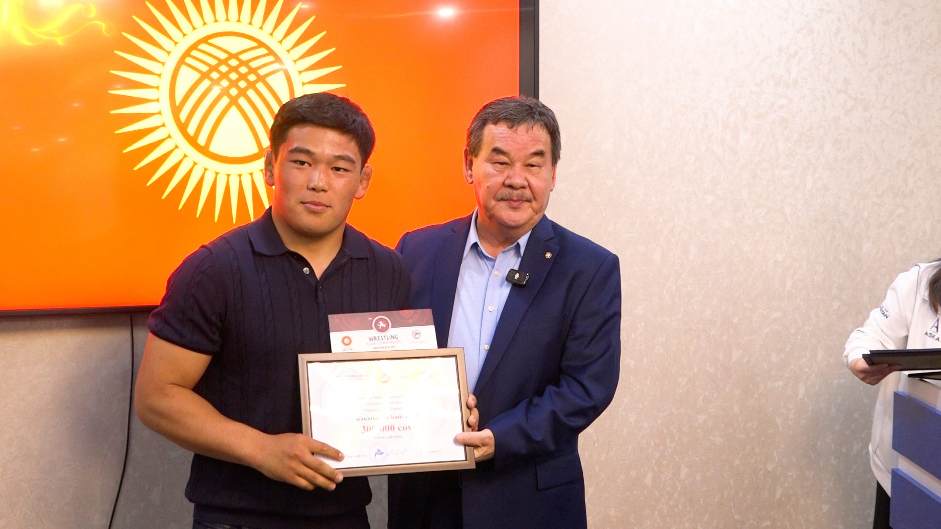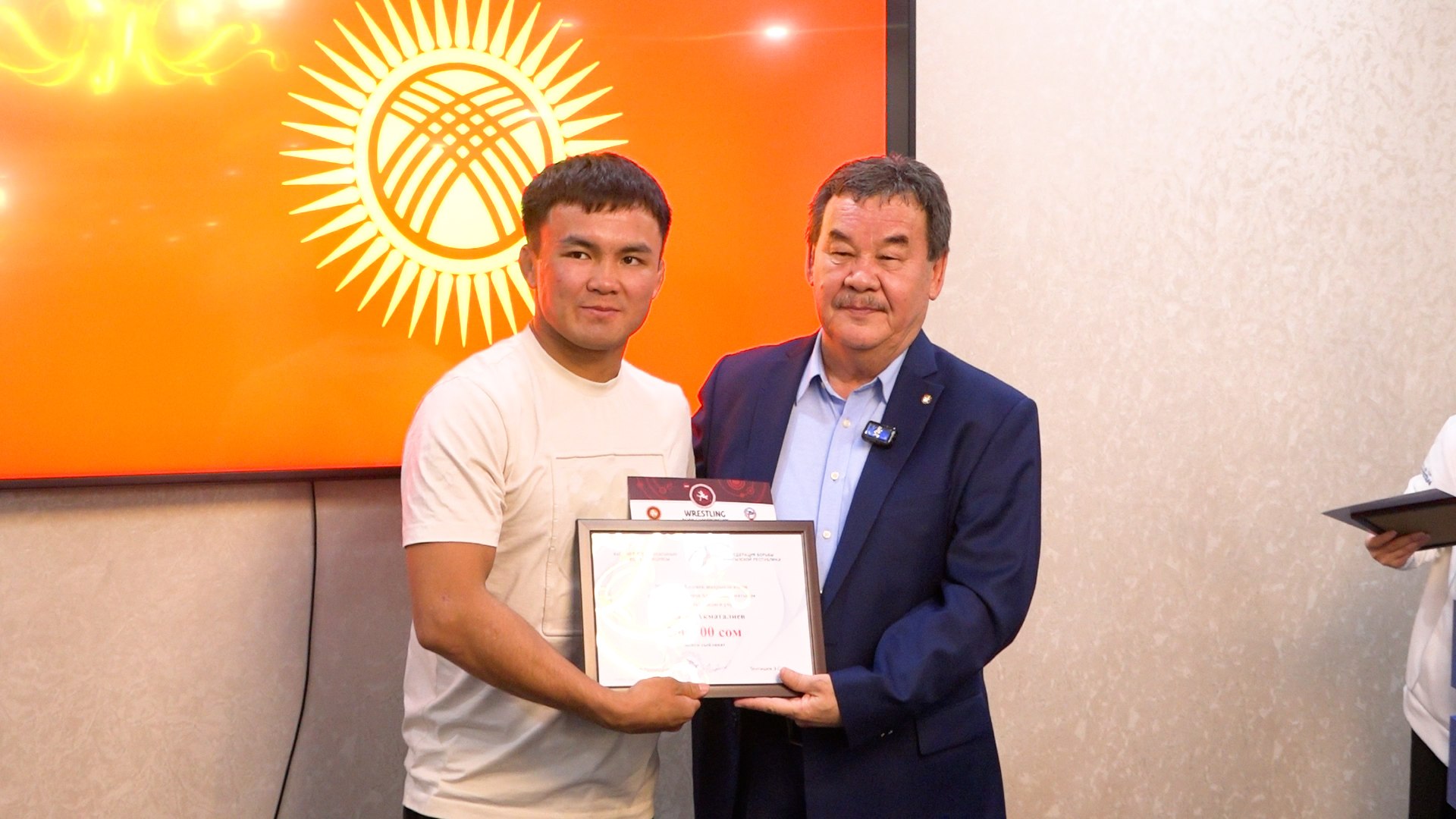 - Бронзовые медалисты (вольная борьба): Яков Чаплин, Абдымалик Карачов, Эрназар Акматалиев и Жакшылык Байташов. От Федерации борьбы — по 300 тысяч сомов, от Азиатского международного университета — по 70 тысяч сомов каждому.