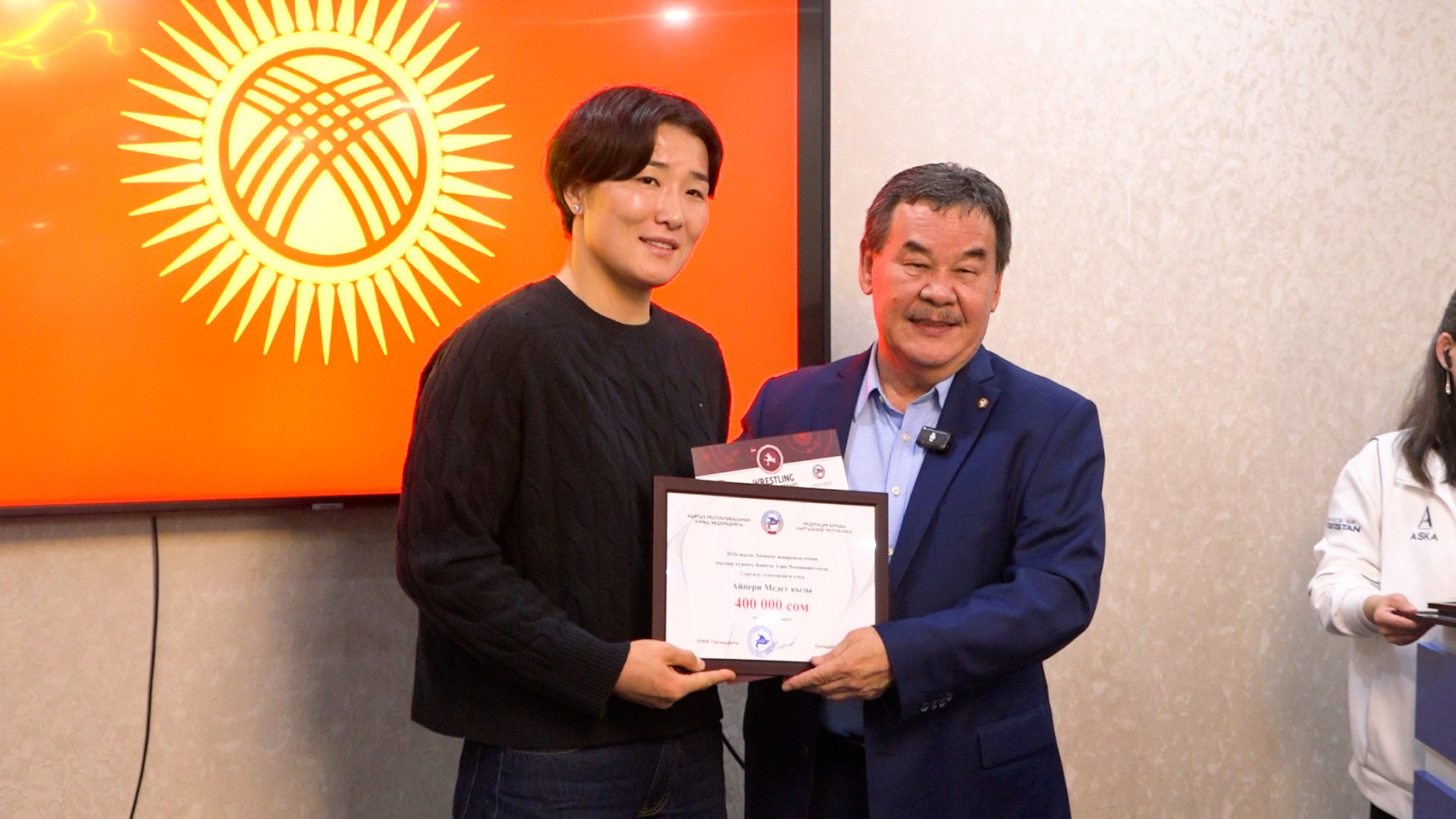 - Серебряная медалистка: Айпери Медет кызы: от Федерации борьбы — 400 тысяч сомов, от Азиатского международного университета — 100 тысяч сомов.