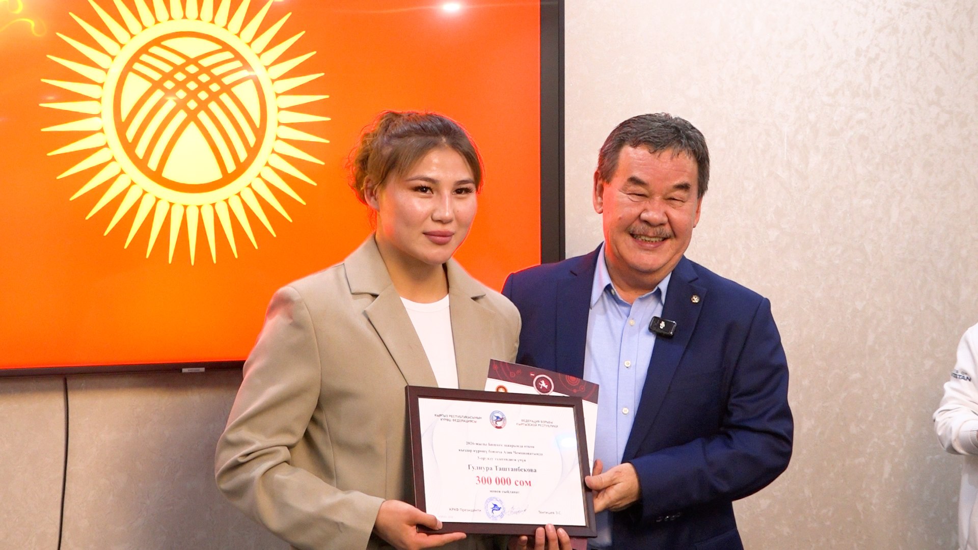 - Золотая медалистка (женская борьба): Мээрим Жуманазарова: от Федерации борьбы — 500 тысяч сомов, от Азиатского международного университета — 150 тысяч сомов.