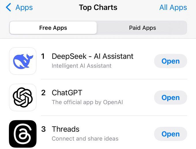 Приложение DeepSeek возглавило рейтинг бесплатных загрузок приложений в Apple App Store в Китае и США, обогнав ChatGPT в рейтинге загрузок в Соединенных Штатах.
