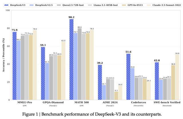 DeepSeek выпустила версию DeepSeek-V3, LLM с открытым кодом, который соответствует производительности ведущих американских моделей, но требует гораздо меньше затрат на обучение. В тестах производительности DeepSeek-V3 превосходит Llama 3.1 от Meta и другие модели с открытым кодом. DeepSeek-V3 соответствует или даже превосходит ChatGPT-4o, уступая лишь Claude 3.5 Sonnet от Anthropic.