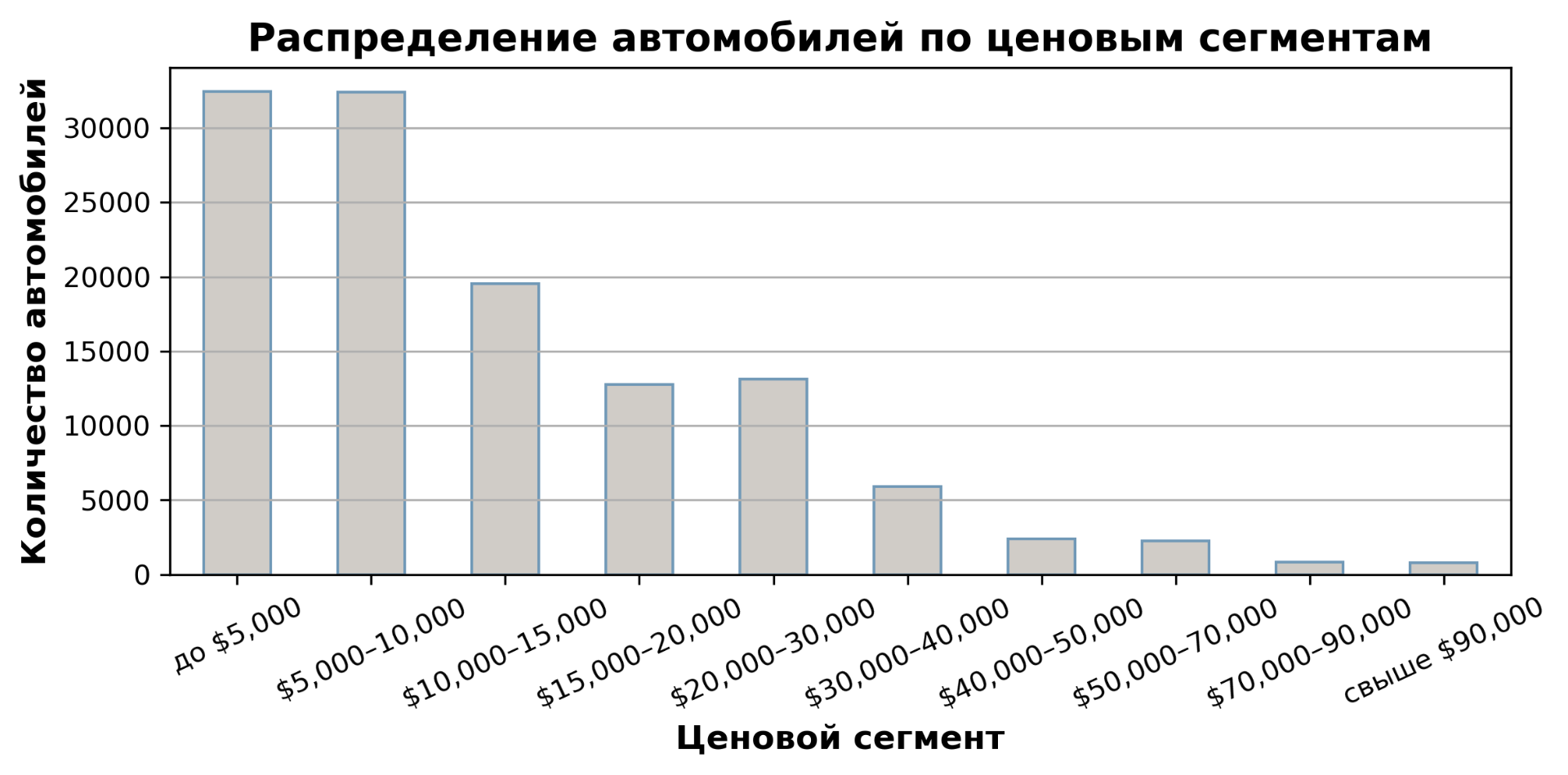 После отметки $10 тысяч количество авто начинает снижаться, однако сегмент $20-30 тысяч показывает неожиданный рост — он даже немного опережает категорию $15-20 тысяч.