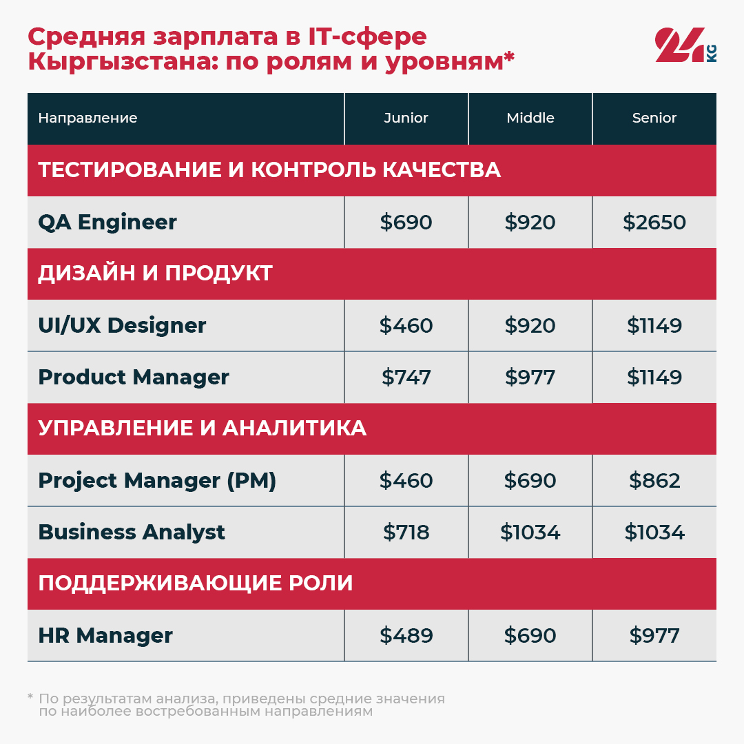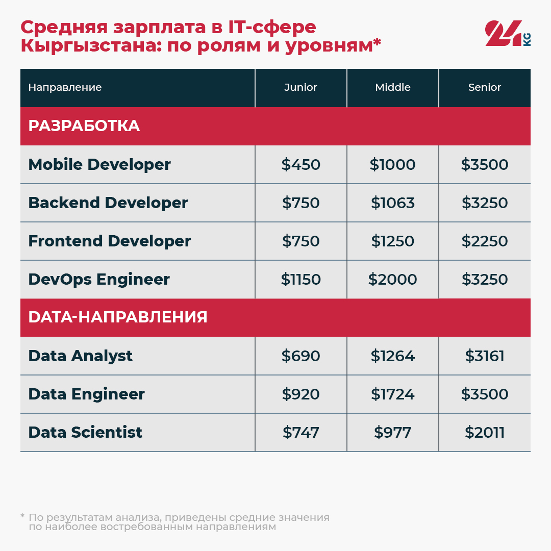 Средняя заработная плата IT-специалиста в Кыргызстане составляет $1302 в месяц.